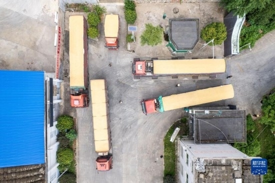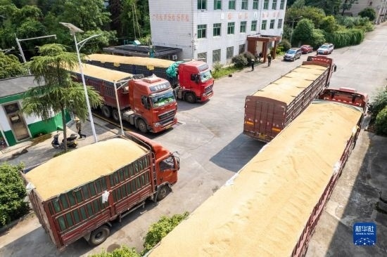 8月7日,運(yùn)糧車在湖南安仁國家糧食儲備庫排隊過磅(無人機(jī)照片)。