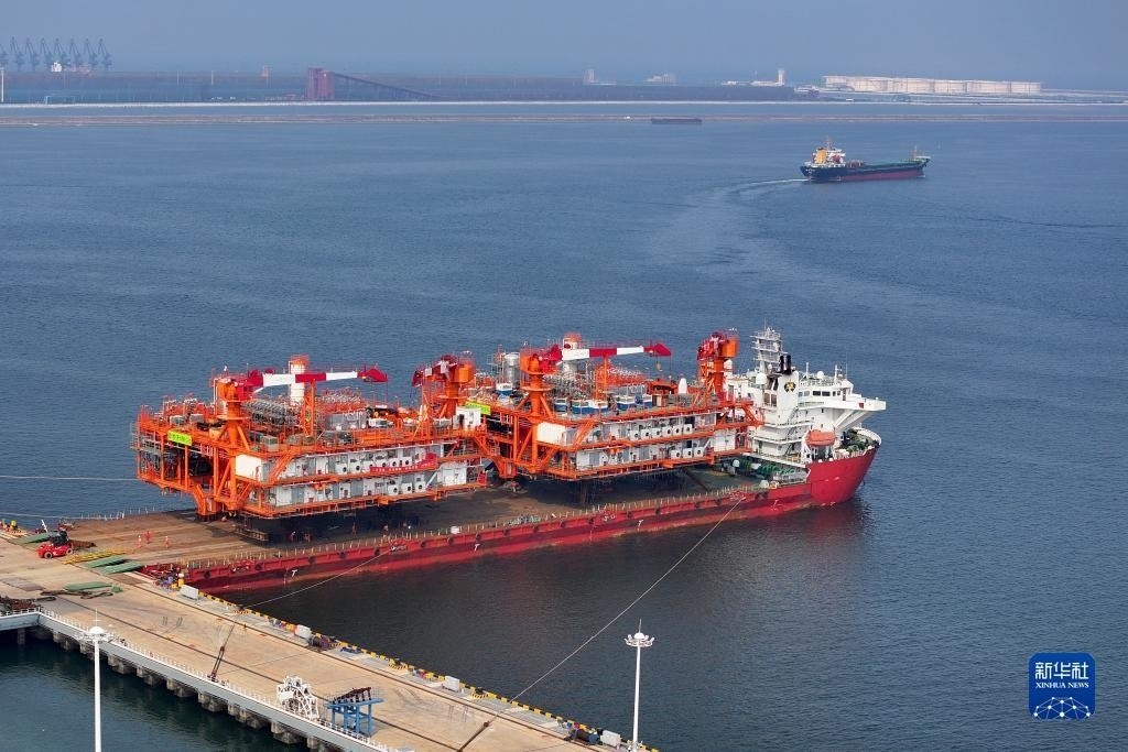 這是8月9日在天津濱海新區(qū)拍攝的渤中19-6凝析氣田I期開發(fā)項目組塊裝船作業(yè)現場(無人機照片)。組塊裝船后將赴渤海西部海域,進入海上安裝和聯調階段。