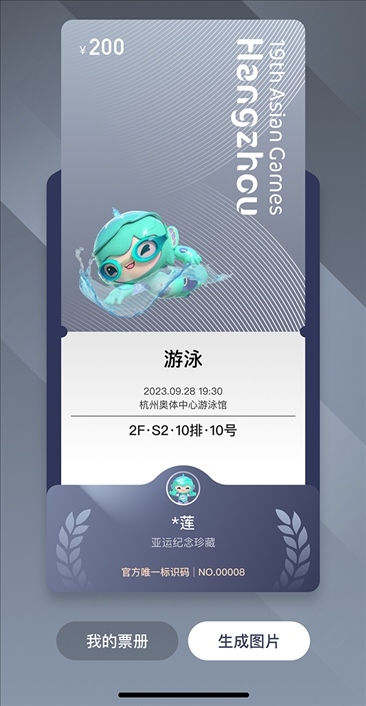 為呼吁全民助力綠色亞運,杭州亞運會推薦使用電子票。凡購買電子票的用戶均可在公眾售票官網(wǎng)H5頁面、智能亞運一站通?票務(wù)通票夾中抽取對應(yīng)項目的電子紀念票,生成專屬票冊,方便收藏、分享、傳播。電子紀念票分金、銀、銅、通用四種類型,抽中比例分別為5%、10%、15%、70%。電子紀念票和專屬電子票冊首次運用于國內(nèi)舉辦的綜合性運動會,是智能辦賽理念的生動體現(xiàn)。