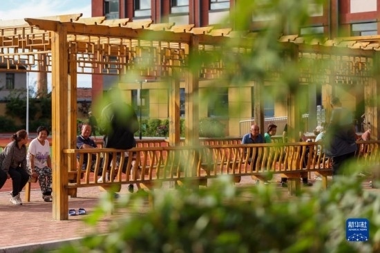 8月11日,居民在吉林省舒蘭市舒蘭三中居民安置點院內(nèi)的長廊里休憩。