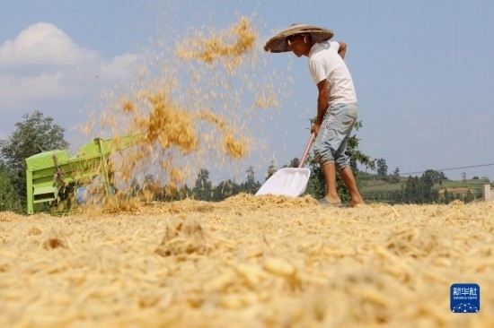 8月11日,在湖南省婁底市雙峰縣石牛鄉(xiāng)常漢村,農(nóng)民在晾曬稻谷。