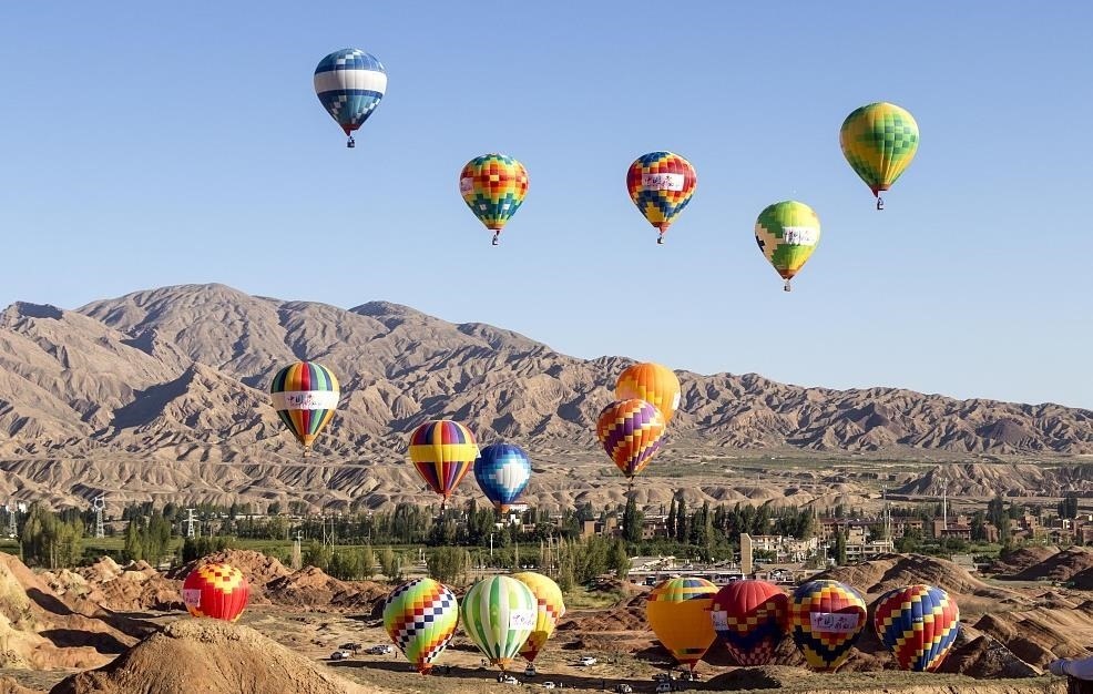 來自全國(guó)各地的熱氣球運(yùn)動(dòng)員駕乘熱氣球,在甘肅張掖七彩丹霞上空進(jìn)行飛行表演,上演熱氣球與丹霞的美麗邂逅。