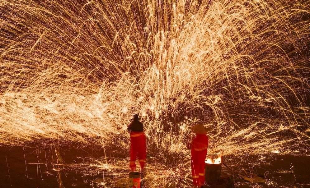 鄂爾多斯文化產(chǎn)業(yè)園景區(qū),民間藝人表演“鐵花秀”。