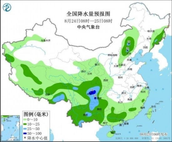 全國降水量預(yù)報(bào)圖(8月24日08時(shí)-25日08時(shí))