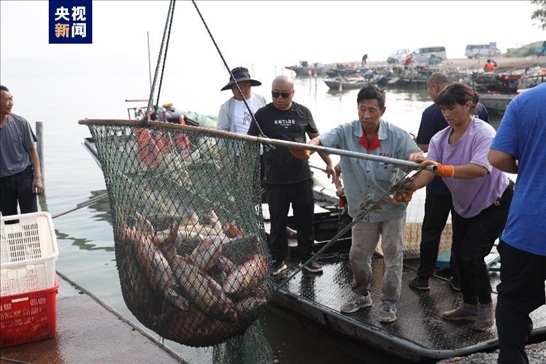 在滿載而歸的漁船上既有鯉魚(yú)、鰱魚(yú)、草魚(yú)、鱖魚(yú)、鯽魚(yú),還有河蟹、小龍蝦、甲魚(yú)等湖鮮,其中漁民劉忠誠(chéng)捕捉到一條 41.6斤的鰱魚(yú),獲得今年的鰱魚(yú)王稱號(hào)。