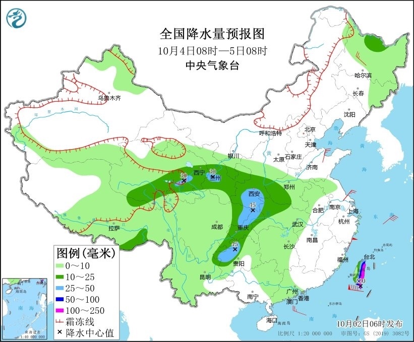 10月4日08時至5日08時,西藏東南部、青海中東部、甘肅中南部等地部分地區(qū)有中到大雪或雨夾雪,局地有暴雪。黑龍江北部、陜西中南部、四川東部、重慶、貴州西部、湖北西北部、河南西部以及臺灣島大部等地部分地區(qū)有中到大雨,其中,臺灣島東部和南部等地部分地區(qū)有暴雨或大暴雨(100~220毫米)。內蒙古中部、黑龍江西南部、山東中部等地部分地區(qū)有4~6級風。渤海、渤海海峽、黃海大部、東海北部將有6~7級風、陣風8級,東海西南部海域風力將有7~8級風、陣風9級。臺灣以東洋面將有12~14級風、陣風15級,臺灣海峽將有10~12級風、陣風13級,巴士海峽將有11~12級風、陣風13級(見圖3)。