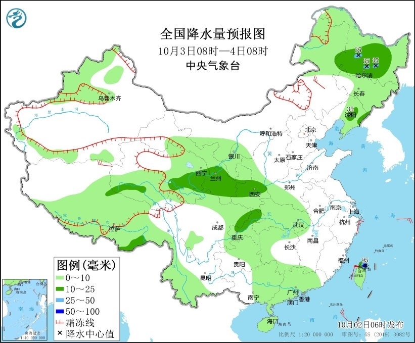 10月3日08時至4日08時,黑龍江西南部、遼寧東部、西藏東南部、青海東部、甘肅東南部、陜西中南部、重慶北部以及臺灣島北部等地部分地區(qū)有中到大雨,其中,臺灣島北部和東部等地部分地區(qū)有暴雨(50~95毫米)。內蒙古東南部、西藏北部等地部分地區(qū)有4~6級風。渤海、渤海海峽、黃海大部、東海北部將有6~7級風、陣風8級,東海西南部海域風力將有7~8級風、陣風9級。臺灣以東洋面將有7~8級轉9~10級風、陣風9級轉11級(見圖2)。