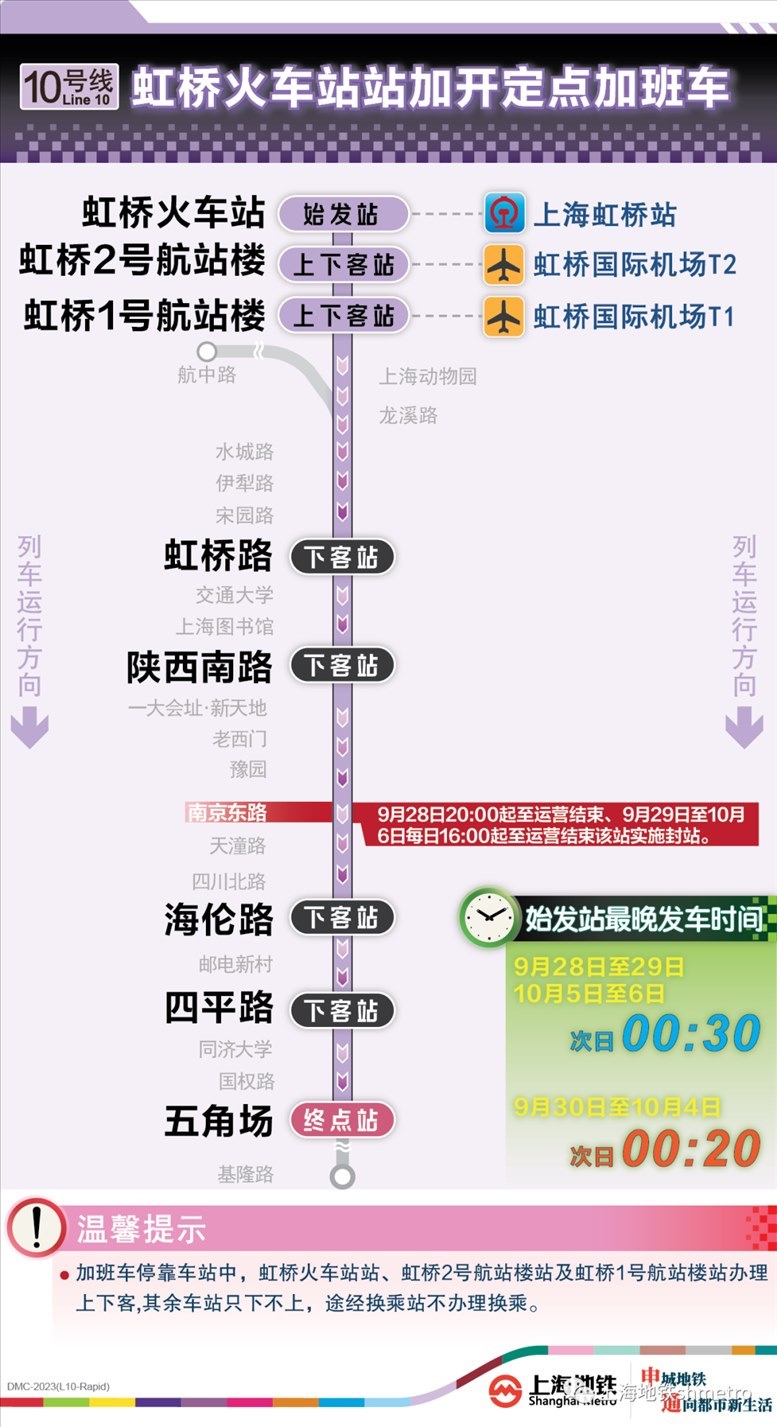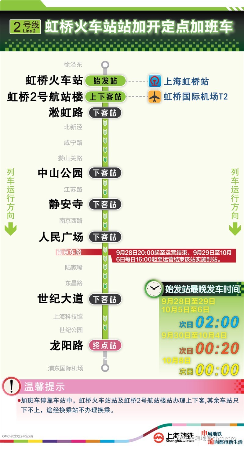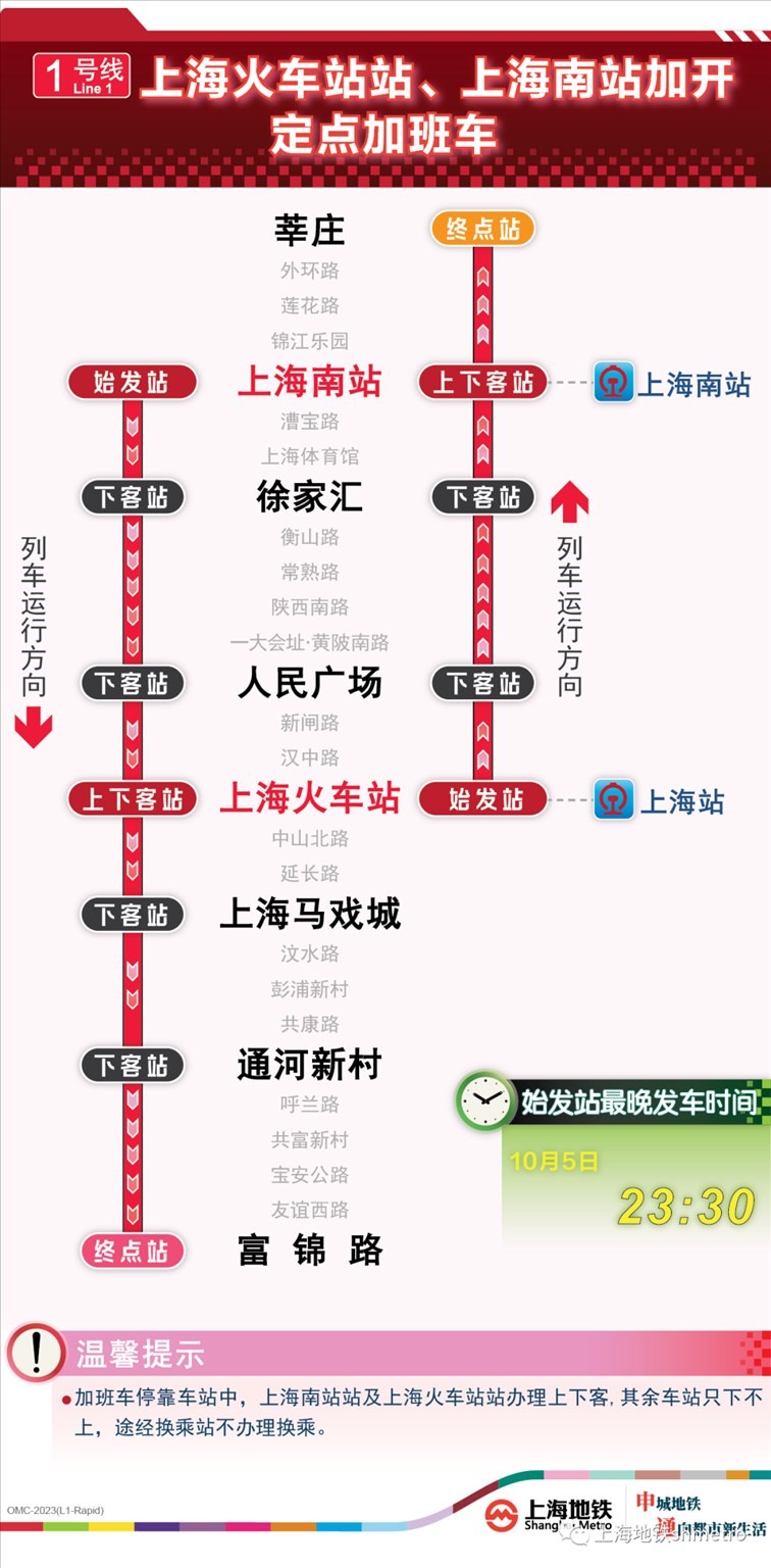 此外為做好節(jié)假日返程期間上海火車站、虹橋火車站、上海南站的夜間客流疏散工作,10月5日,地鐵1號(hào)線在圖定基礎(chǔ)上實(shí)施定點(diǎn)加開(kāi)方案,加開(kāi)末班車發(fā)車時(shí)間至23:30;另10月8日地鐵2號(hào)線增加定點(diǎn)加班車班次,加開(kāi)末班車發(fā)車時(shí)間至次日0:00。