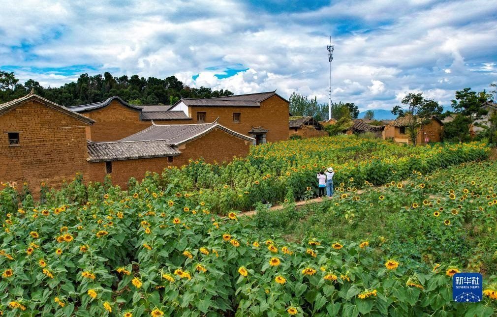 10月3日,游客在位于云南省昆明市滇池邊的臥龍古漁村內(nèi)游覽拍照(無人機(jī)照片)。