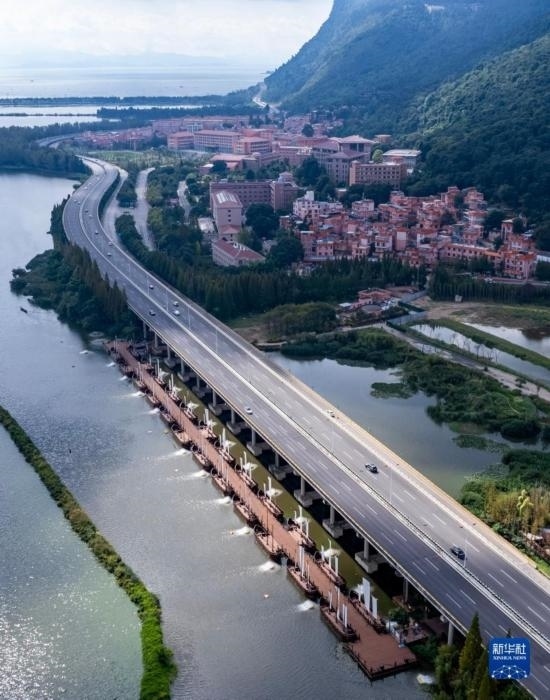 這是10月6日拍攝的位于高速公路橋下的滇池綠道草海段鋼浮橋(無(wú)人機(jī)照片)。