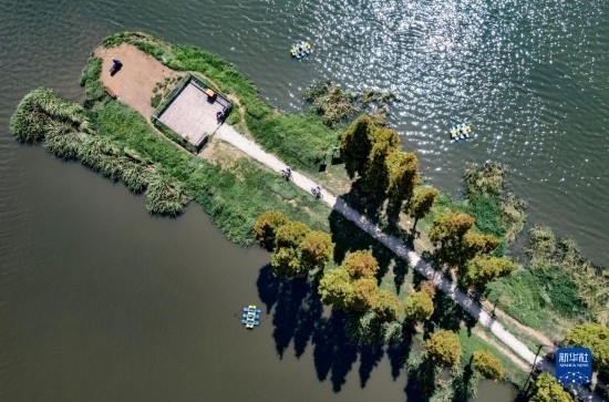 10月6日,市民在由滇池綠道串聯(lián)的干尾溝濕地公園游覽(無(wú)人機(jī)照片)。