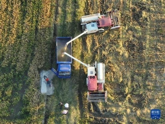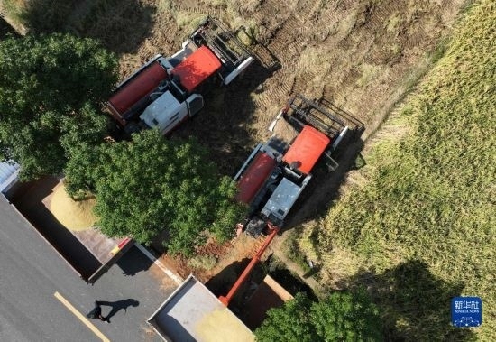 10月18日,湖南省衡陽(yáng)市衡山縣白果鎮(zhèn),農(nóng)機(jī)手駕駛收割機(jī)搶收晚稻(無(wú)人機(jī)照片)。