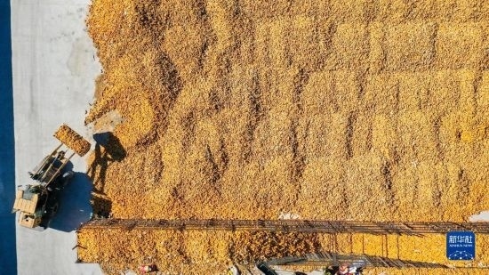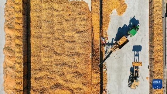 10月19日,在吉林省公主嶺市友忠種植農(nóng)民專業(yè)合作社,農(nóng)民將收獲的玉米放入科學(xué)儲糧倉(無人機(jī)照片)。