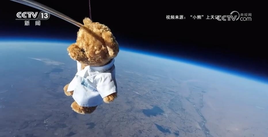 氦氣球托升著一只毛絨小熊,在泛著藍(lán)色光暈的地球上漂浮旋轉(zhuǎn)。本周二,這則小熊萬(wàn)米飛天、與地球合影的視頻,被稱(chēng)為理工生的優(yōu)雅浪漫。