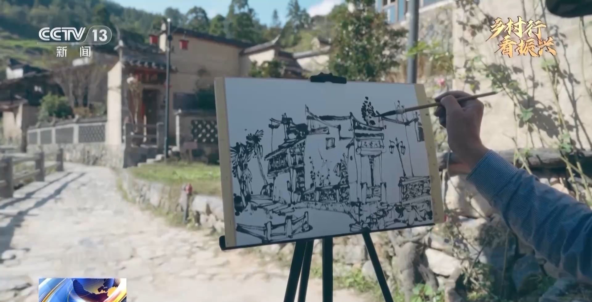 總臺記者 林姍蓉:這里就是龍?zhí)洞?。沿著溪水一路往下,你可以看到兩岸都是這種高低錯落的土夯的民居。這個(gè)季節(jié)柿子都熟了,到處都可以看到村民曬柿餅、曬稻谷,黃綠交錯的,非常好看。來到龍?zhí)?,還有一點(diǎn)非常讓我印象深刻,就是在這里每走幾步,我都可以看到一個(gè)正在寫生創(chuàng)作的藝術(shù)家。