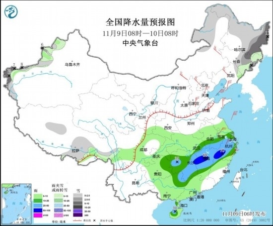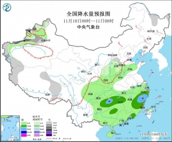 圖3 全國降水量預報圖(11月9日08時-10日08時) 圖片來源:中央氣象臺網站