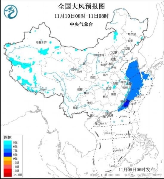 11月10日08時至11日08時,黃海中部和南部海域、東海大部海域、臺灣海峽、南海東北部偏北海域將有7~8級、陣風9~10級的大風。新疆東部和南部、西藏南部和西北部、內蒙古東部、東南沿海將有5~6級、陣風7~8級的大風。中央氣象臺11月9日06時發(fā)布大風藍色預警(見圖1、2)。