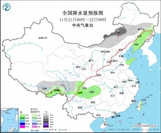 11月21日08時(shí)至22日08時(shí),內(nèi)蒙古中部、黑龍江南部、吉林西部、西藏東南部、川西高原等地部分地區(qū)有小雪或雨夾雪,其中,內(nèi)蒙古中東部、西藏東部等地部分地區(qū)有中到大雪(5~9毫米)。吉林東部、遼寧中東部、山東半島、西藏東南部、四川南部、重慶南部、貴州西北部等地部分地區(qū)有小到中雨,其中,西藏東南部等地部分地區(qū)有大雨(25~30毫米)。內(nèi)蒙古西部和中部、寧夏等地部分地區(qū)有4~6級(jí)風(fēng)(見(jiàn)圖4)。