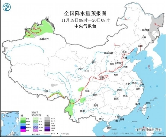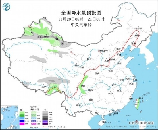 11月19日08時(shí)至20日08時(shí),新疆北部和伊犁河谷、黑龍江東部、吉林東部等地部分地區(qū)有小雪或雨夾雪,其中,新疆北部部分地區(qū)有中到大雪,局地暴雪(10~12毫米)。新疆北部、西藏東南部、四川南部、云南西部等地部分地區(qū)有小雨。內(nèi)蒙古中部和東部、黑龍江東部、遼寧東部等地部分地區(qū)有4~5級(jí)風(fēng)(見(jiàn)圖2)。
