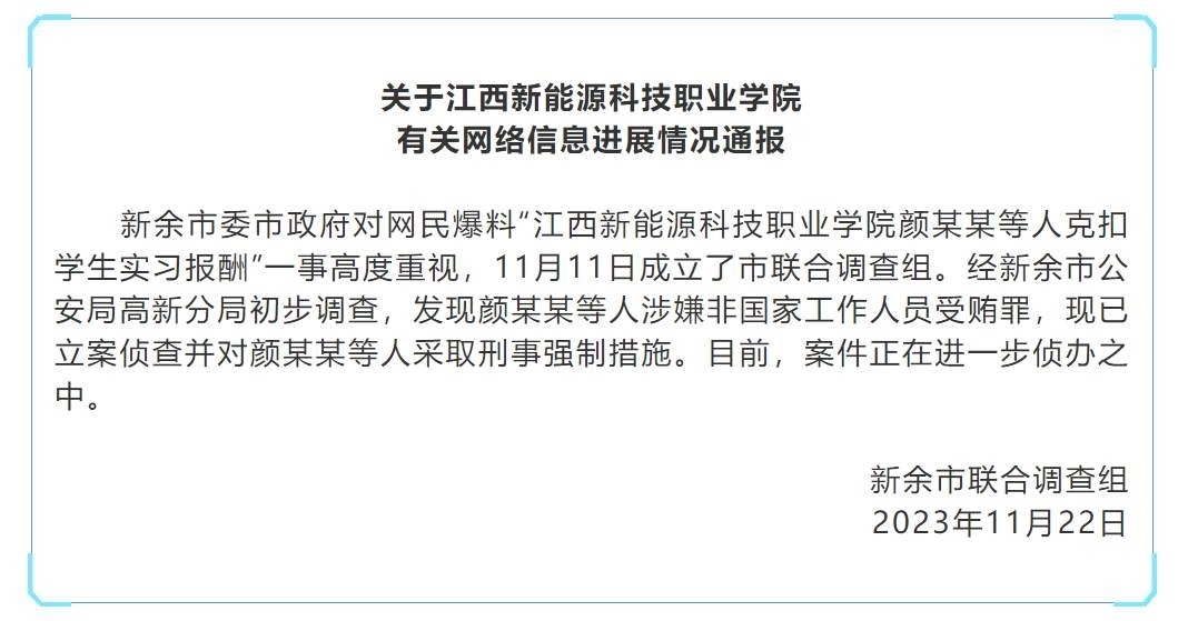 ·江西新余通報一職校被舉報克扣學生實習報酬:多人涉嫌受賄被控制。