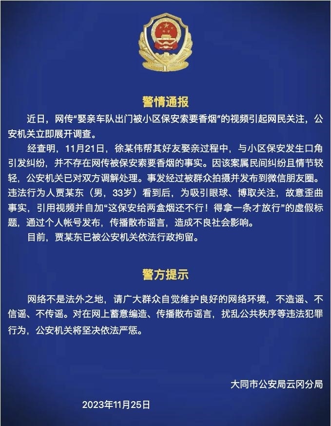 ·大同警方:網傳“娶親車隊出門被小區(qū)保安索要香煙”系謠言。