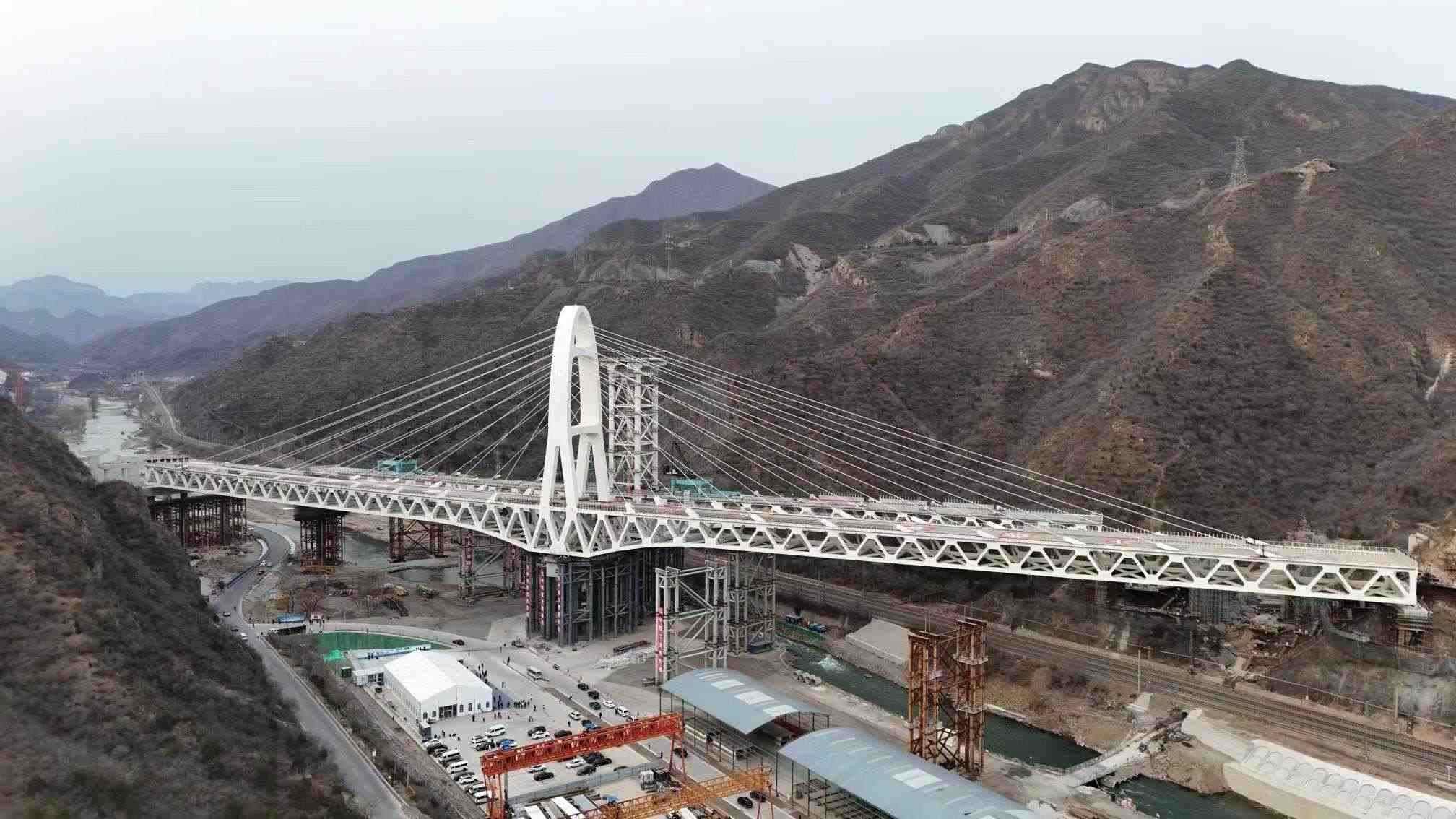 國(guó)道109新線高速公路,貫通門(mén)頭溝區(qū)7個(gè)鎮(zhèn),建成后全線行程時(shí)間將從2小時(shí)以上縮短至1小時(shí)以內(nèi)。中鐵設(shè)計(jì)集團(tuán)2018年起承擔(dān)了本線控制工程安家莊特大橋的設(shè)計(jì)研究任務(wù),橋址地處8度高烈度震區(qū),大橋兩側(cè)山體陡峭,山間瞬時(shí)風(fēng)大且風(fēng)向多變,左、右幅分別位于半徑1600米和1500米的曲線上,需要同時(shí)跨越運(yùn)輸繁忙的豐沙鐵路和既有109國(guó)道以及有行洪要求且為一級(jí)水源地的永定河,橋面距離常水位高差近50米,大橋建設(shè)條件極其苛刻,設(shè)計(jì)、施工極具挑戰(zhàn)。