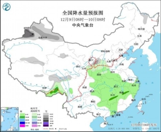 12月9日08時(shí)至10日08時(shí),新疆北疆和南疆盆地南部、西藏北部和東部、青海南部、甘肅西部、寧夏東部、陜西西北部、黑龍江北部等地部分地區(qū)有小到中雪或雨夾雪,其中,新疆沿天山地區(qū)和伊犁河谷、陜西北部等地部分地區(qū)有中到大雪,新疆伊犁河谷等地局地暴雪(10~12毫米)。西藏東南部、陜西中南部、黃淮西部、江淮西部、江漢、江南大部、西南地區(qū)東部、華南北部等地部分地區(qū)有小雨,局地中雨。黑龍江東北部部分地區(qū)有4~6級(jí)風(fēng)。