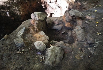 紅石砬子抗日根據地遺址,一處地窨子遺址的灶臺。新華社記者張博宇 攝