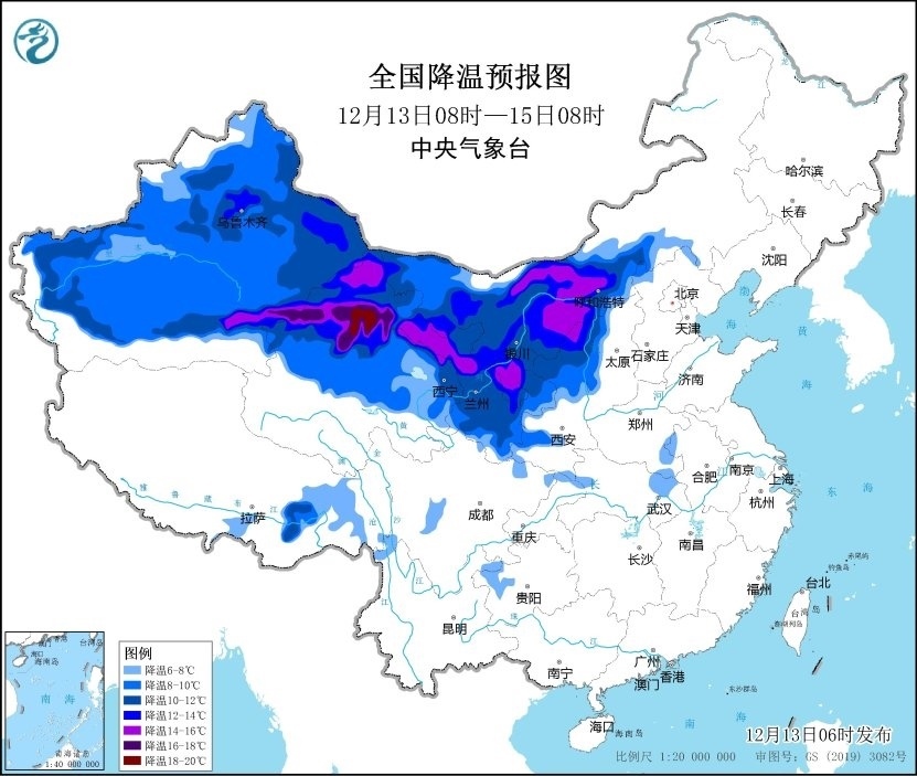 其中,12月13日08時至12月15日08時,新疆、內(nèi)蒙古西部和中部、甘肅、寧夏、青海、陜西北部、山西西部等地將出現(xiàn)8~12℃降溫,甘肅、寧夏、內(nèi)蒙古河套地區(qū)、陜西北部局地降溫可達14℃以上。
