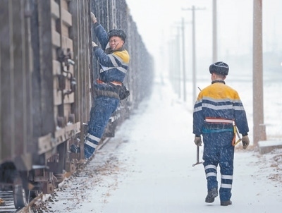 中國鐵路呼和浩特局集團有限公司呼和浩特站調車組人員在冒雪進行列車編組作業(yè)。 張 棖 王語欣攝影報道