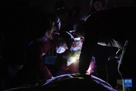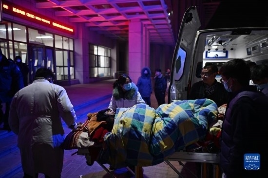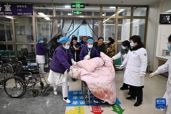 12月19日,在甘肅省臨夏回族自治州積石山保安族東鄉(xiāng)族撒拉族自治縣中西醫(yī)結(jié)合醫(yī)院門口,醫(yī)務工作者查看傷者情況。