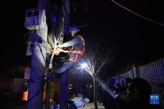 12月19日,在甘肅省臨夏回族自治州積石山保安族東鄉(xiāng)族撒拉族自治縣中西醫(yī)結(jié)合醫(yī)院門口,電力部門工作人員搶修電力設施。