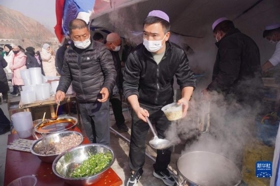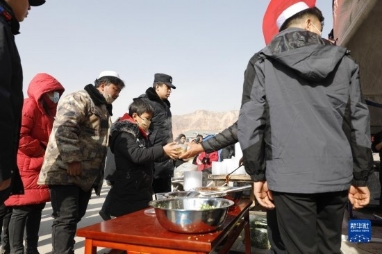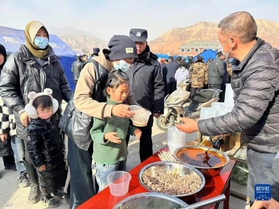 12月19日,在甘肅臨夏積石山縣大河家鎮(zhèn)大河村安置點(diǎn),受災(zāi)群眾領(lǐng)取愛心牛肉面。