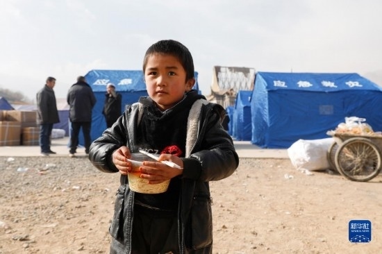 12月19日,在甘肅臨夏積石山縣大河家鎮(zhèn)大河村安置點(diǎn),小朋友領(lǐng)取愛心牛肉面。