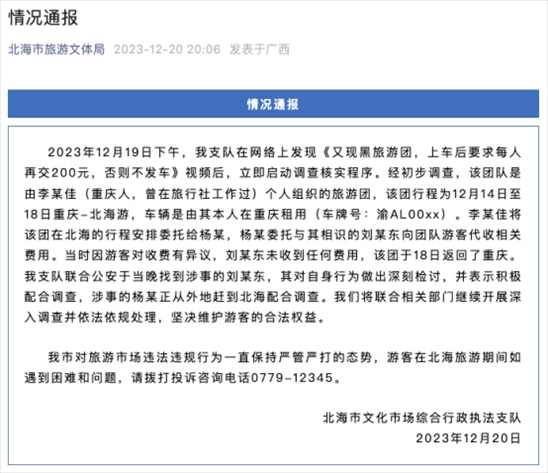 ·官方通報(bào)“廣西一旅行團(tuán)要求游客上車后每人再交200元”。