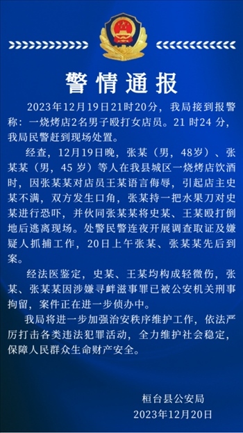 ·淄博一燒烤店2名男子毆打女店員,警方通報(bào):涉事者已被刑拘。