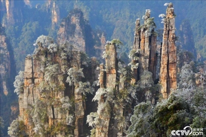 2023年12月19日,湖南省張家界市,張家界國家森林公園雪后放晴,天子山景區(qū)同現(xiàn)云海日出雪松冰掛等多種美景,美若仙境。