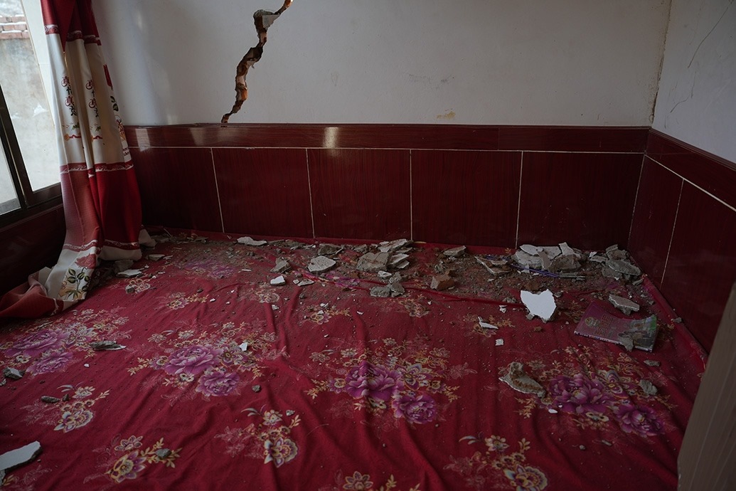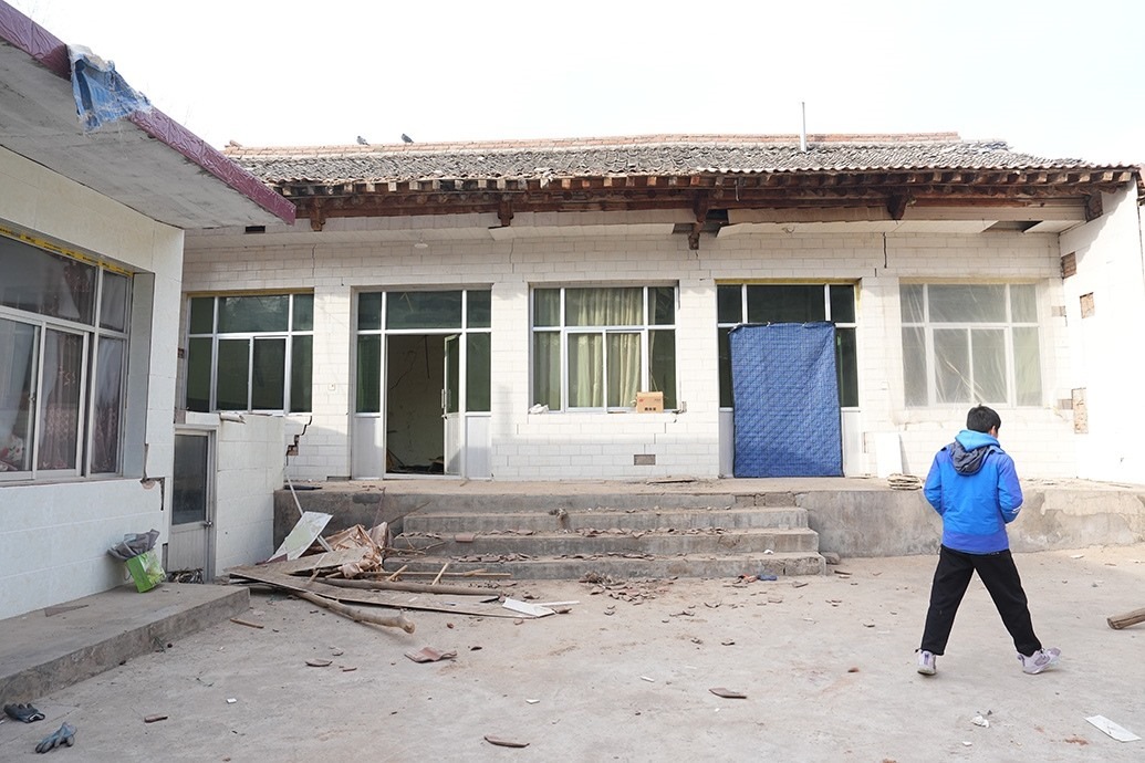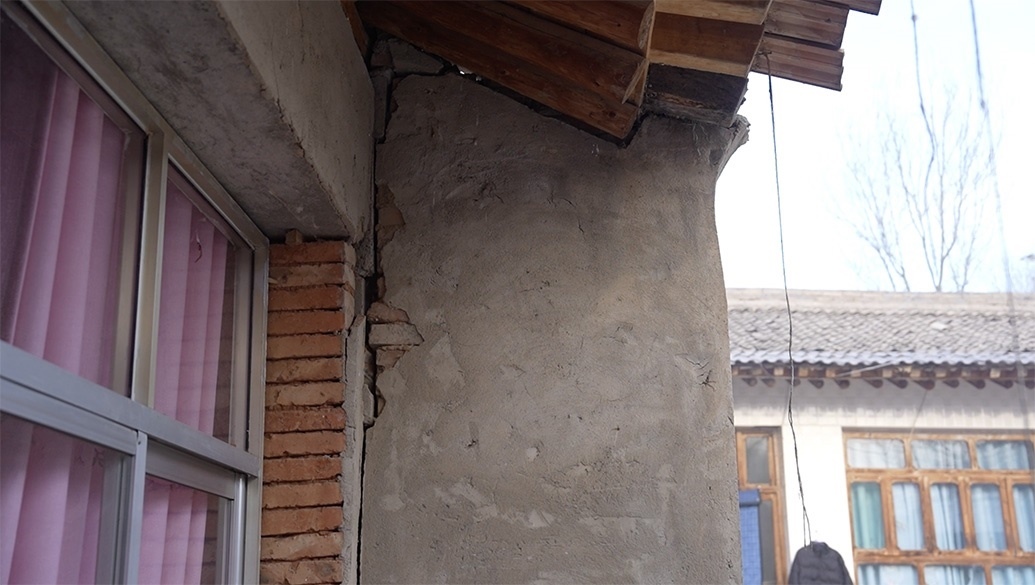 12月23日當(dāng)天,馬國忠和叔叔伯伯兩家都在家門前搭起剛領(lǐng)的帳篷。叔叔馬進明家受損嚴(yán)重,兩堵磚墻的銜接處完全開裂,像條拉鏈被猛地拽下;天花板掉了大半,木頭架構(gòu)的屋頂赫然露在豁口里。所幸,他和家人平時在縣城租房住。