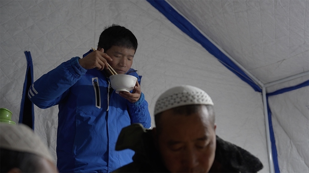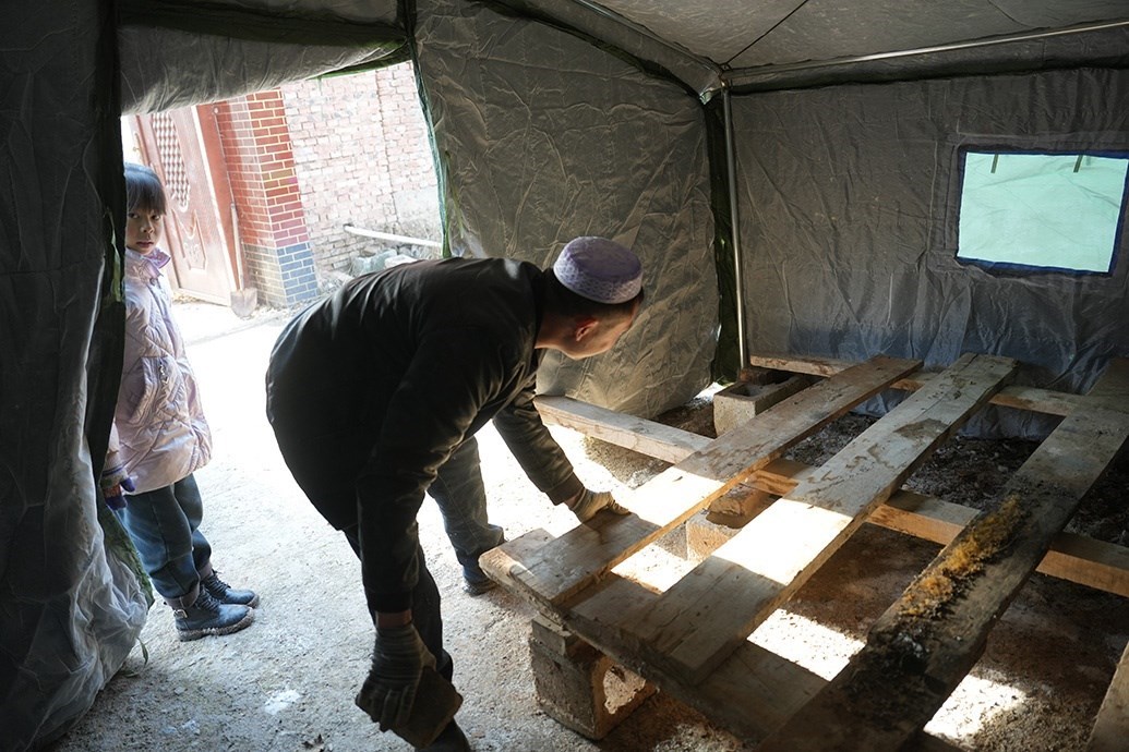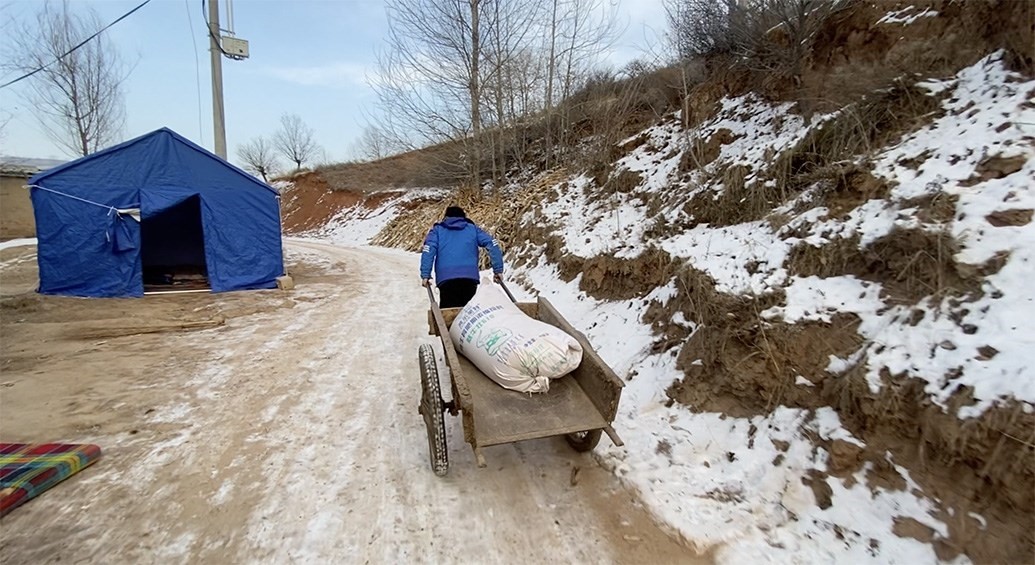 12月20日,馬國忠一家回到村里,拿塑料布在家附近搭了個簡易帳篷,兩根木頭、一條橫梁支起來,怕煙筒把塑料烤化,帳篷里不能烤火,頂多防風(fēng),但馬國忠覺得比車?yán)飶姸嗔?。家里的電熱毯拿出來鋪上,他才睡了個安穩(wěn)覺。只是半夜來了余震,又醒了。他止不住想:下一步怎么辦?后面會不會繼續(xù)搖?他家鋼管焊的牛棚頂晃得“乒乒乓乓”響。