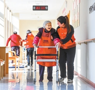 江西宜春市袁山社區(qū)養(yǎng)老服務(wù)中心工作人員在陪老人散步。 周 亮攝(人民視覺)