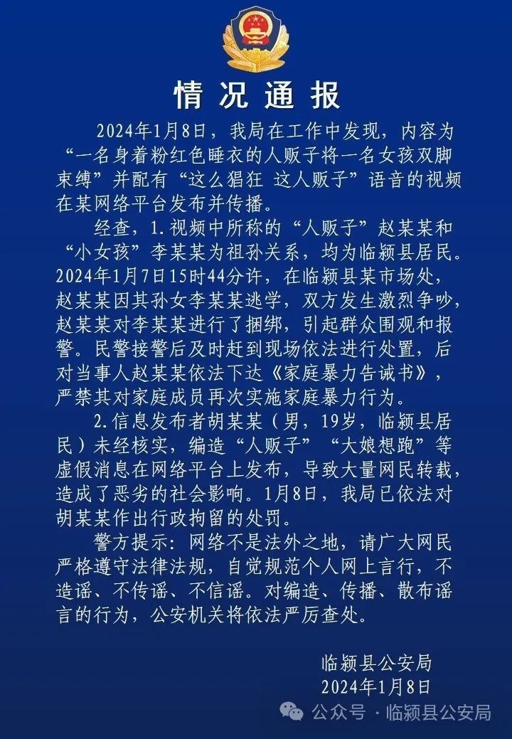 ·河南警方辟謠人販子將女孩雙腳綁縛:兩人系祖孫關系,造謠者被行政拘留。