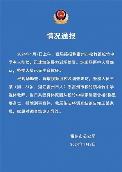 ·廣東湛江一中學老師墜樓,警方通報:排除刑事案件。