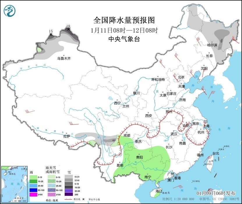 1月11日08時(shí)至12日08時(shí),新疆北部、內(nèi)蒙古東北部、黑龍江、吉林東部、川西高原南部等地的部分地區(qū)有小到中雪或雨夾雪,其中新疆阿勒泰、塔城、伊犁河谷等地的部分地區(qū)有大雪,局地暴雪(10~18毫米);四川南部、湖南西南部、貴州、云南東部、廣西等地的部分地區(qū)有小雨。內(nèi)蒙古中東部、東北地區(qū)南部、華北東部、山東半島、西藏等地的部分地區(qū)有4~6級(jí)風(fēng);黃海北部、臺(tái)灣海峽、臺(tái)灣以東洋面、巴士海峽、南海東北部和西南部等海域有6~7級(jí)風(fēng)、陣風(fēng)8~9級(jí)(見圖3)。