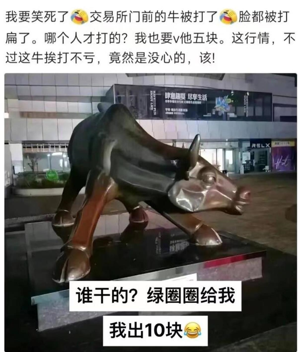 帖文中寫道:交易所的牛被砸了?請別這么極端,冤有頭債有主,牛何其無辜。牛被打臉、??招氖切苁泻笃谔卣鳌?/p>