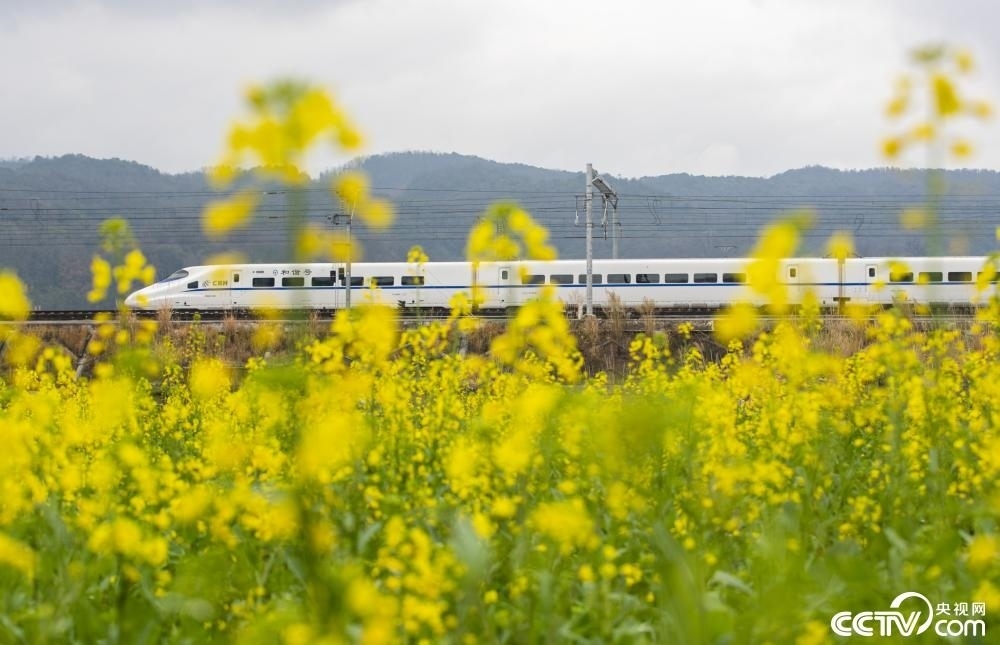 貴州黔東南,飛馳的高鐵行駛在鄉(xiāng)村田園間,與盛開(kāi)的油菜花相映成景。