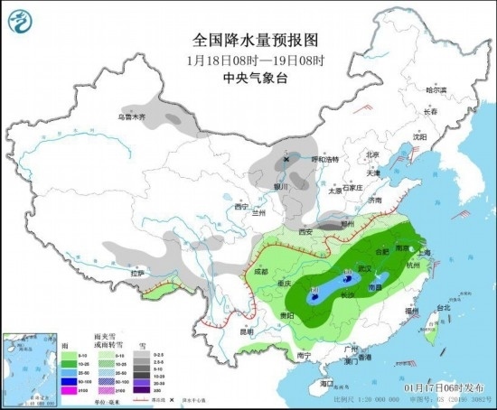 1月18日08時(shí)至19日08時(shí),內(nèi)蒙古西部、新疆北疆東部、西藏東部、西北地區(qū)東部、黃淮西部和南部、川西高原北部等地部分地區(qū)有小到中雪或雨夾雪,局地有大雪(5毫米)。江淮、江漢、江南北部和西部、西南地區(qū)東部、廣西等地部分地區(qū)有小到中雨,其中,湖南北部和西部、江西北部等地部分地區(qū)有暴雨(50~60毫米)。內(nèi)蒙古中部、遼東半島等地部分地區(qū)有4~6級(jí)風(fēng)(見圖2)。