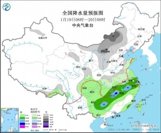 1月18日08時至19日08時,新疆北部、西北地區(qū)東部、內(nèi)蒙古中西部、黃淮西部和南部、江淮北部、湖北西北部以及西藏東部等地部分地區(qū)有小到中雪或雨夾雪,局地有大雪。江淮南部、江漢東部、江南北部和西部、西南地區(qū)東南部等地部分地區(qū)有中到大雨,其中,湖北南部、湖南東北部和西部等地部分地區(qū)有暴雨(50~60毫米)。內(nèi)蒙古東南部、遼寧大部、華北東部、山東半島、江南東部等地部分地區(qū)有4~6級風(fēng)(見圖1)。