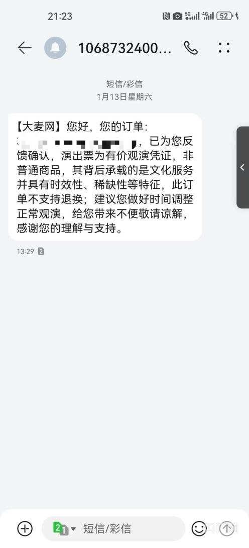 周女士說(shuō)自己第一時(shí)間就通過(guò)多個(gè)渠道嘗試退票,但都沒(méi)有成功。“人工客服的工作時(shí)間是早上9點(diǎn)到晚上8點(diǎn),我打電話的時(shí)候不在他們工作時(shí)間范圍內(nèi)。當(dāng)時(shí)也確實(shí)聯(lián)系不到其他渠道,于是我就在12315,包括黑貓投訴進(jìn)行退票退款的申請(qǐng)。13號(hào)早上9點(diǎn),大麥客服說(shuō)此訂單不支持退換,13號(hào)下午1點(diǎn)半的時(shí)候,給了我一個(gè)反饋短信,說(shuō)是已為我反饋確認(rèn),演出票為有價(jià)觀影憑證非普通商品,其背后承載的是文化服務(wù),并具有時(shí)效性、稀缺性等特征,此訂單不支持退換,然后就建議我做好時(shí)間調(diào)整正常觀演?!?/p>