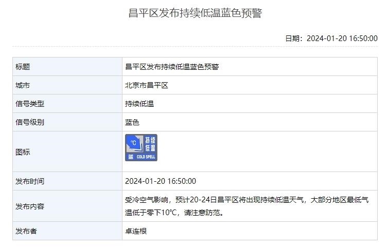 1月20日,北京延慶、懷柔、昌平3區(qū)發(fā)布持續(xù)低溫藍(lán)色預(yù)警。受冷空氣影響,預(yù)計(jì)20—24日這3個(gè)區(qū)將出現(xiàn)持續(xù)低溫天氣,其中延慶、懷柔兩地大部分地區(qū)氣溫低于零下15℃,請(qǐng)注意防范。