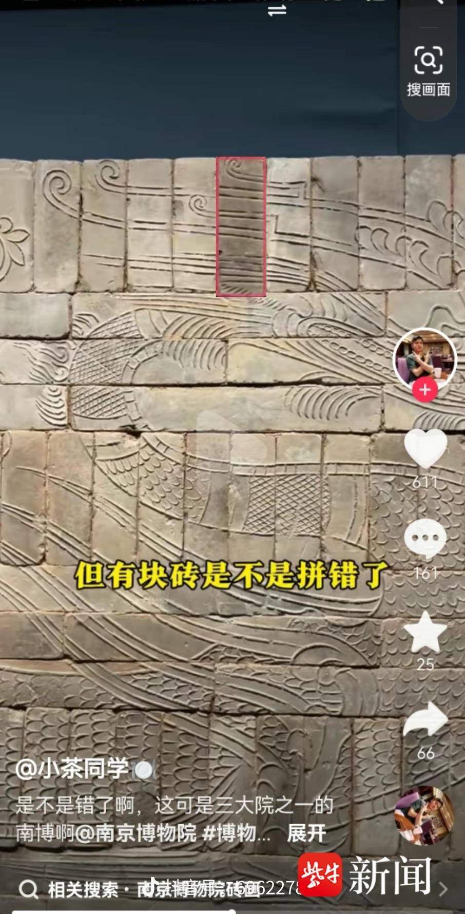 “家人們,我好像在南博發(fā)現(xiàn)了一件展品有一處錯誤”,網(wǎng)友“小茶同學”發(fā)視頻表示,“1月25日去南京博物院游覽,在看到《羽人戲龍磚畫》時,發(fā)現(xiàn)磚畫很精美,保留很完整。磚畫上的陽刻線條尤其讓我感到震撼,看到深色磚的部分,我感覺有點別扭,當時就臆想著那塊磚反過來是不是更好一點,于是發(fā)了一個視頻求助?!?/p>
